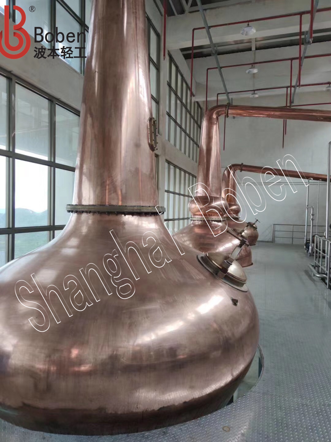 专业用于蒸馏威士忌,采用粗馏精馏组合二次蒸馏。加热方式有内置蒸汽煮沸装置和外置煮沸循环装置加热。由蒸馏釜、天鹅颈、莱恩臂、冷凝器、酒精安全箱等组成,主体部件采用全紫铜材质,容积大小可以根据客户需求定制。