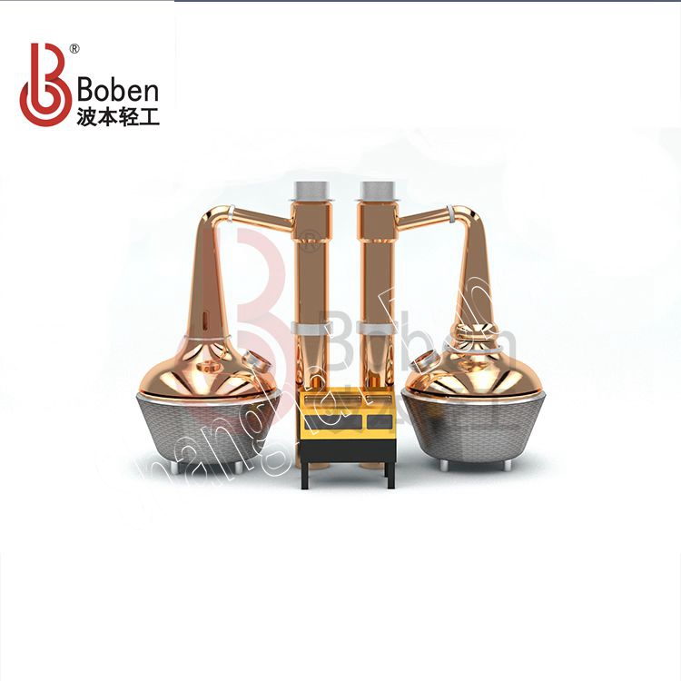 专业用于蒸馏威士忌,采用粗馏精馏组合二次蒸馏。加热方式有内置蒸汽煮沸装置和外置煮沸循环装置加热。由蒸馏釜、天鹅颈、莱恩臂、冷凝器、酒精安全箱等组成,主体部件采用全紫铜材质,容积大小可以根据客户需求定制。