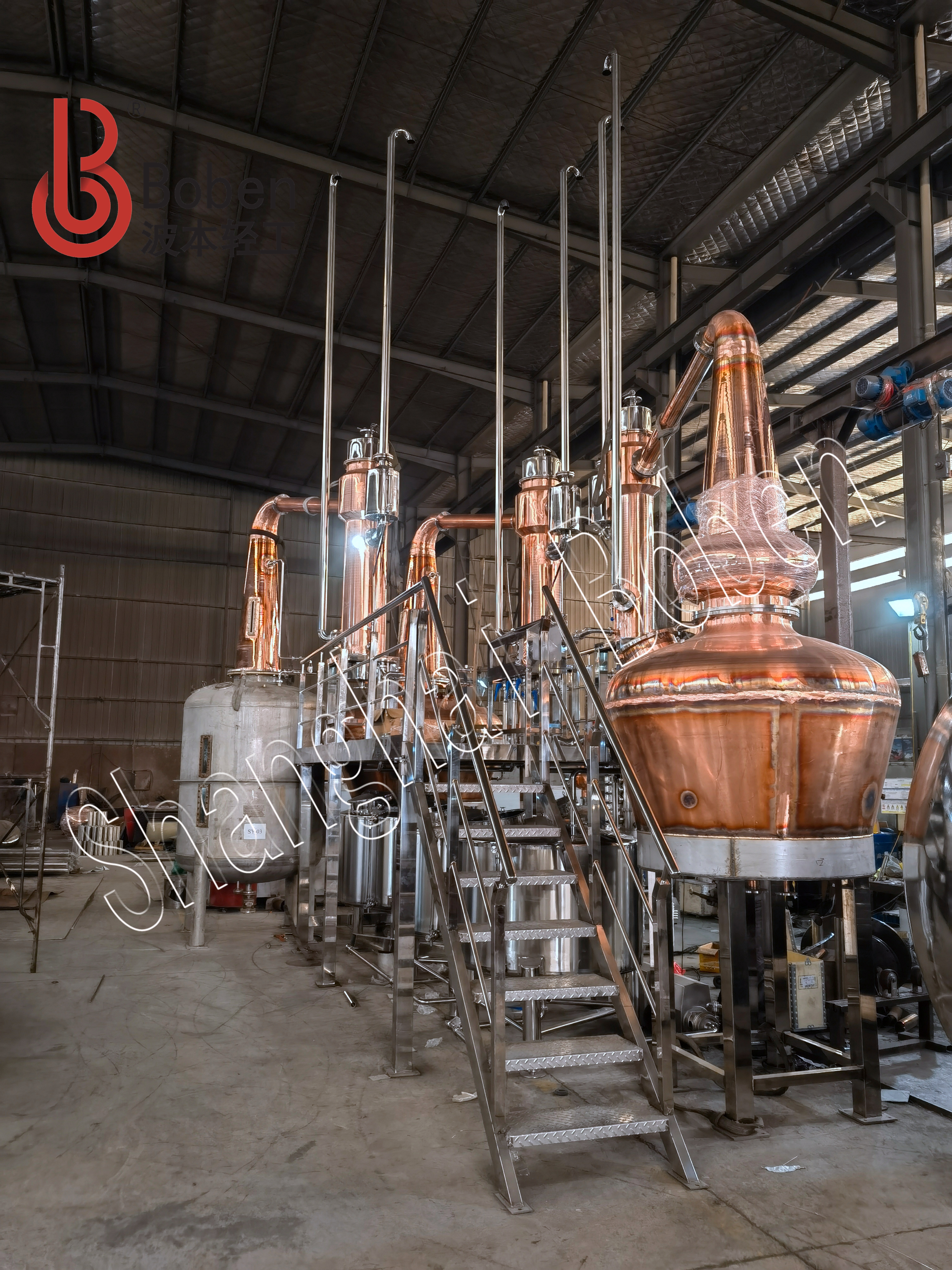 专业用于蒸馏威士忌,采用粗馏精馏组合二次蒸馏。加热方式有内置蒸汽煮沸装置和外置煮沸循环装置加热。由蒸馏釜、天鹅颈、莱恩臂、冷凝器、酒精安全箱等组成,主体部件采用全紫铜材质,容积大小可以根据客户需求定制。
